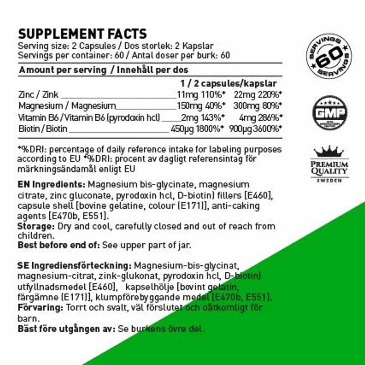 Innhold: Sink (fra Zn-glukonat) 11 mg *(110% ri) Magnesium (fra Mg-bis-glycinat og Mg-citrat) 125 mg *(34% ri) Vitamin B6 (pyrodoksin hcl) 2 mg *(143% ri) Biotin 450mcg *(ikke bestemt)