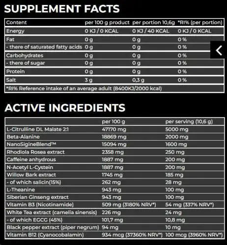 Ingredienser: vann, L-citrulline-DL-malate, beta-alanine, smakstilsetning, koffein (anhydrous), søtning: sukralose og acesulfam-K, surhetsregulator: eplesyre, konserveringsmiddel: natriumbenzonat, fargestoff.